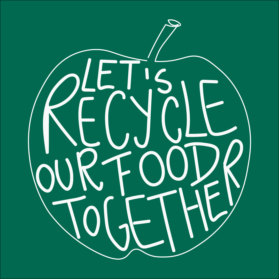 The phrase ‘Let’s recycle our food together’ directly conveys the campaign’s aim of reducing food waste while also inviting collective action. The use of ‘Let’s’ and ‘Together’ underscores the importance of shared responsibility and community engagement